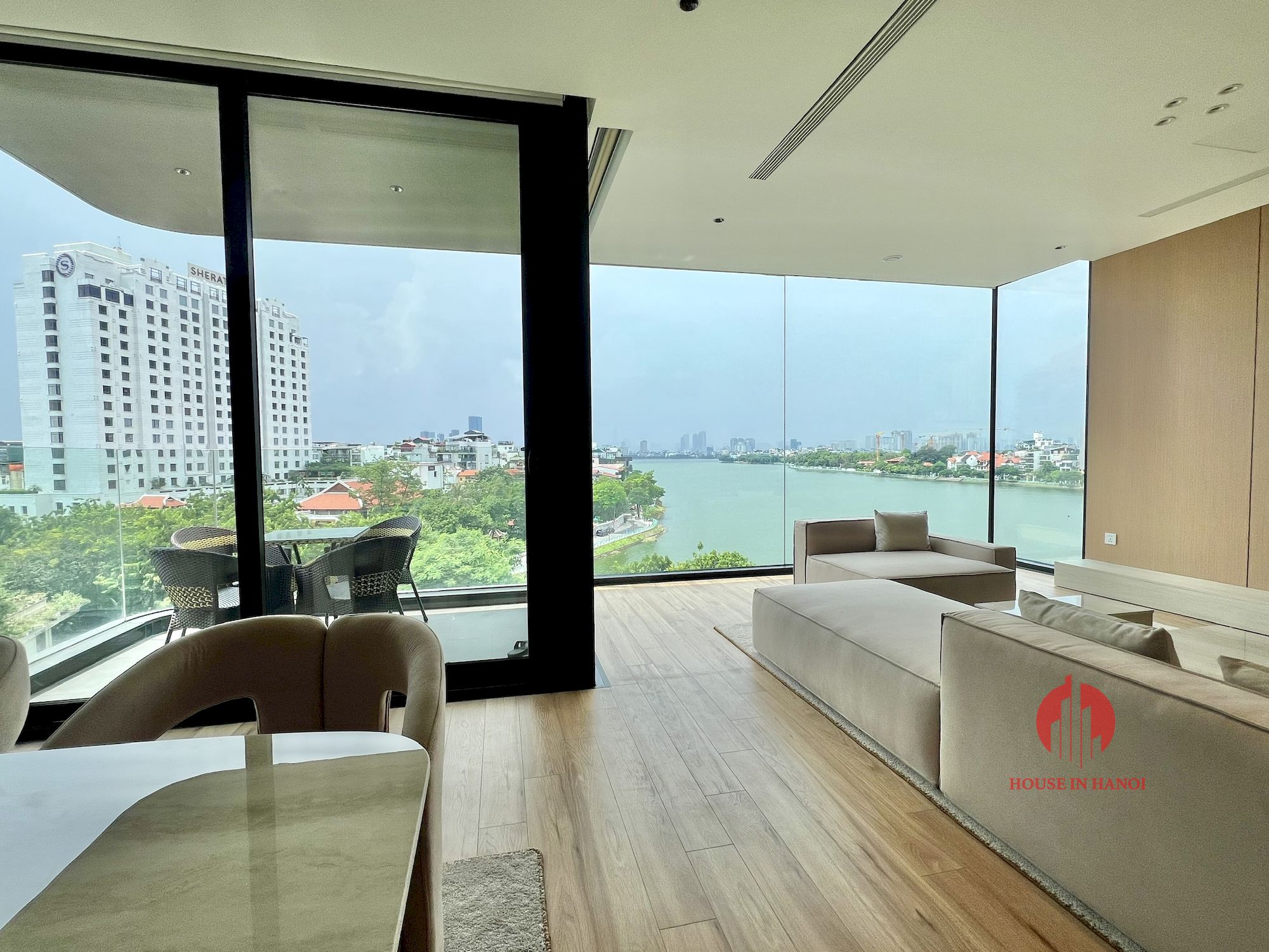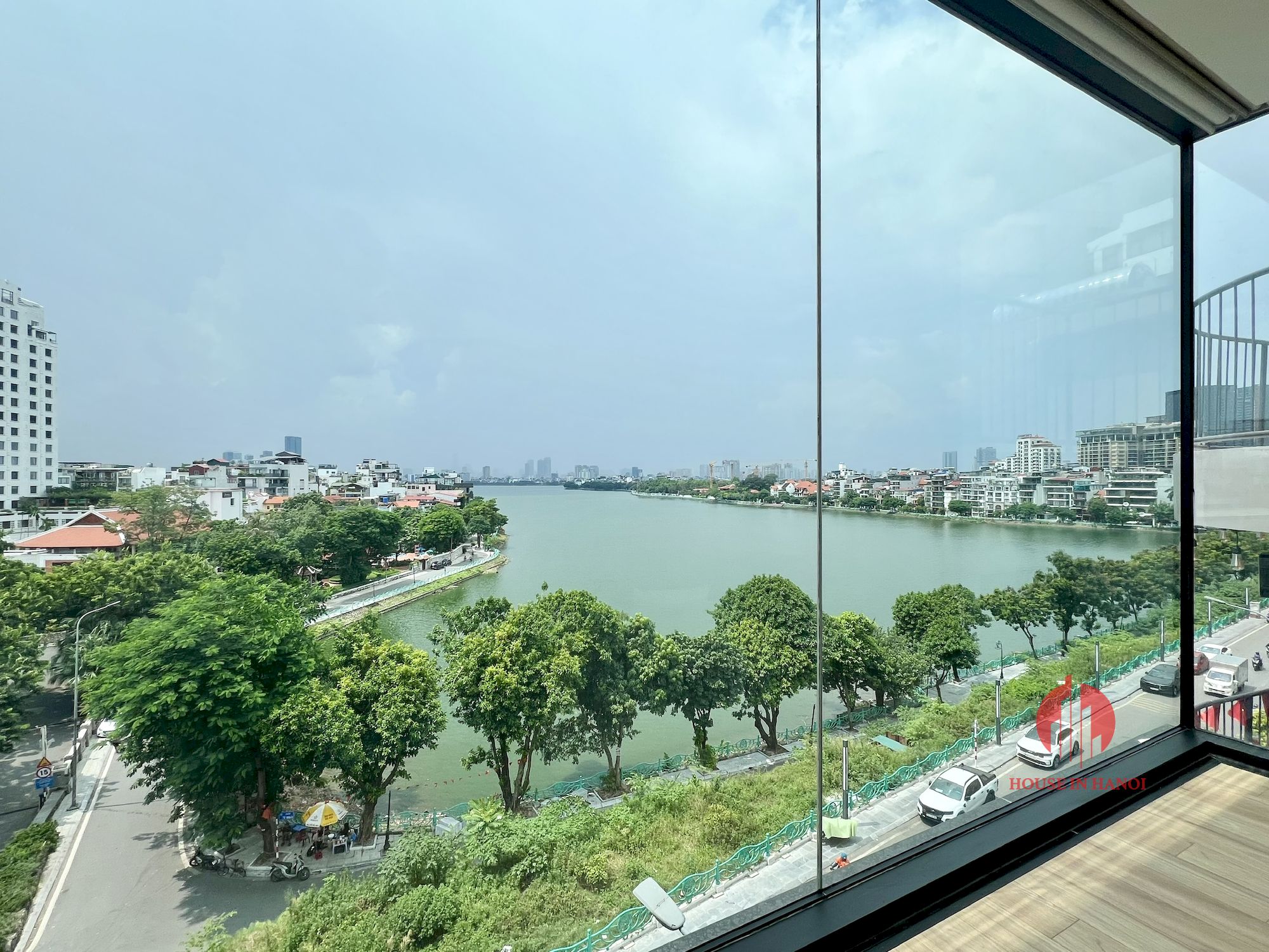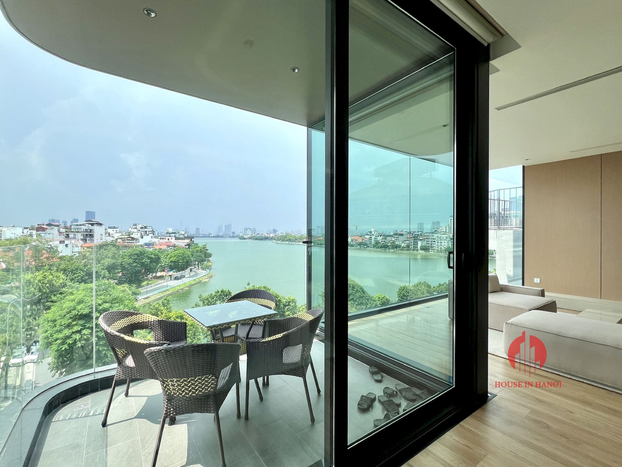 Elegant open-plan living room with large sofa, panoramic West Lake view, balcony, and a contemporary kitchen with island